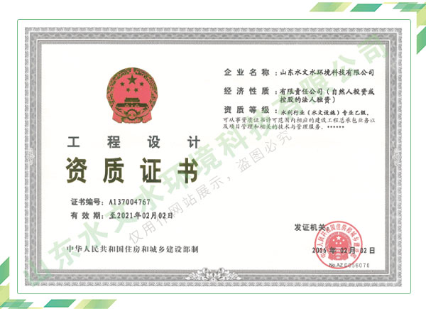 公司擁有水利工程設(shè)計、水土保持、水文水資源調(diào)查評價、水資源論證、建設(shè)項目環(huán)境影響評價、市政公用工程施工總承包、水利水電工程施工總承包、電子與智能化工程專業(yè)承包等資質(zhì),2017年通過質(zhì)量管理體系、環(huán)境管理體系、職業(yè)健康安全管理體系認(rèn)證;2020年被評為國家級高新技術(shù)企業(yè),同年被中國水利企業(yè)協(xié)會推薦為第一批“合同節(jié)水服務(wù)企業(yè)”;2021年被山東省、濟南市評為 “專精特新”中小企業(yè)。業(yè)務(wù)范圍涉及水利工程設(shè)計;節(jié)水設(shè)計、改造、水平衡測試;山洪災(zāi)害調(diào)查;城市水資源調(diào)查評價;建設(shè)項目水土保持方案編制、監(jiān)測、驗收、水土保持規(guī)劃;水安全保障規(guī)劃、建設(shè)項目水資源論證、規(guī)劃水資源論證;建設(shè)項目環(huán)境影響評價;入河排污口論證;防洪影響評價;市政公用工程施工、水利水電工程施工、電子與智能化工程施工等。